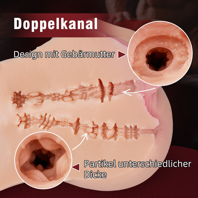 Dual-Kanal: Dual-Design-Kanäle, zwei Kanäle mit unterschiedlichen Partikeln saugen Ihren Penis fest an, mit einem Uterus-Design im Inneren, das Ihnen ein echtes Erlebnis bietet; die Tasten der beiden Kanäle sind weit voneinander entfernt und lassen sich nicht leicht zerreißen
