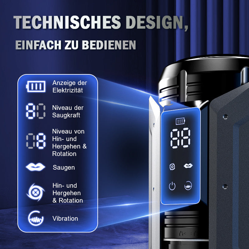 Möchten Sie sich nach einem anstrengenden Tag im Büro entspannen? Dieser Masturbator verfügt über stoßende, rotierende und vibrierende Saugfunktionen, die eine beeindruckende Intensität von 300 Mal pro Minute erreichen, um Ihren Körper zu beglücken. Das LCD-Display ermöglicht eine einfache Einstellung in 7 Modi. Die transparente Kristallhülle erhöht die visuelle Attraktivität während der Intimität und steigert die Erregung. Die weiche 3D-Hülle lässt sich für eine optimale Massage auf verschiedene Größen einstellen. Während er sich dreht und saugt, leckt die eingebaute Zunge in der Hülle die Eichel aufreizend um 360 Grad für einen unvergesslichen oralen Höhepunkt. 100% wasserdicht, genießen Sie Duschorgasmen, ohne das Badezimmer zu verlassen.