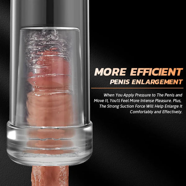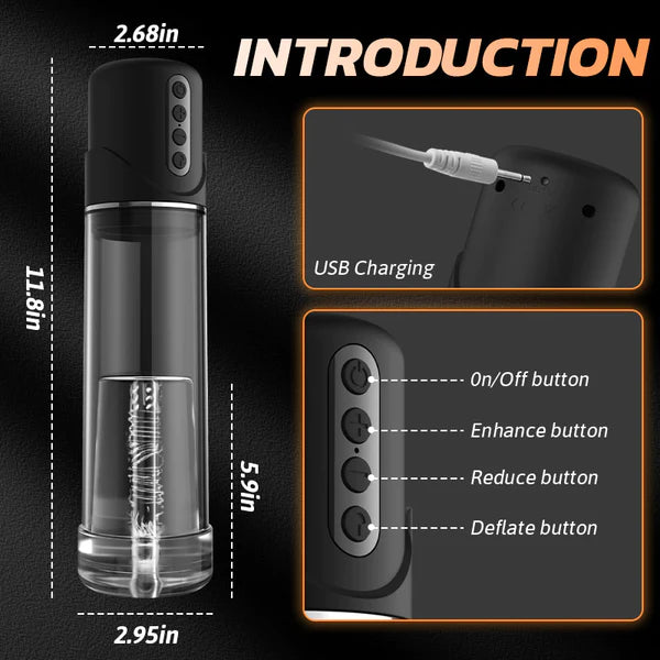 Beobachten Sie, wie Ihr Schwanz in dem langen, transparenten Raum wächst! Sie werden von der zusätzlichen Größe und Superhärte begeistert sein! Ein transparenter Zylinder überbrückt den schwarzen Griff, eingebettet in einen leistungsstarken Motor und eine reich strukturierte, ultraelastische TPE-Hülle im Inneren. Aufregende Falten, Beulen und Fäden drücken und treffen Ihren Schwanz, und die 4-Stufen-Saugkraft hilft bei ihrer Kraft. Charmanteres Saugen als je zuvor! Darüber hinaus wird Ihr langjähriger Wunsch nach Penisleistung befriedigt. Beginnen Sie Ihre glückliche Reise, drücken Sie lange die Ein-/Aus-Taste, um zu beginnen, und drücken Sie die +/- Taste, um den Sauggrad zu ändern. Um übermäßiges Saugen zu verhindern, gibt es einen Knopf, der speziell entwickelt wurde, um den Druck im Inneren des Zylinders abzulassen. Ihr geschwollener Schaft wird sehr geschätzt!